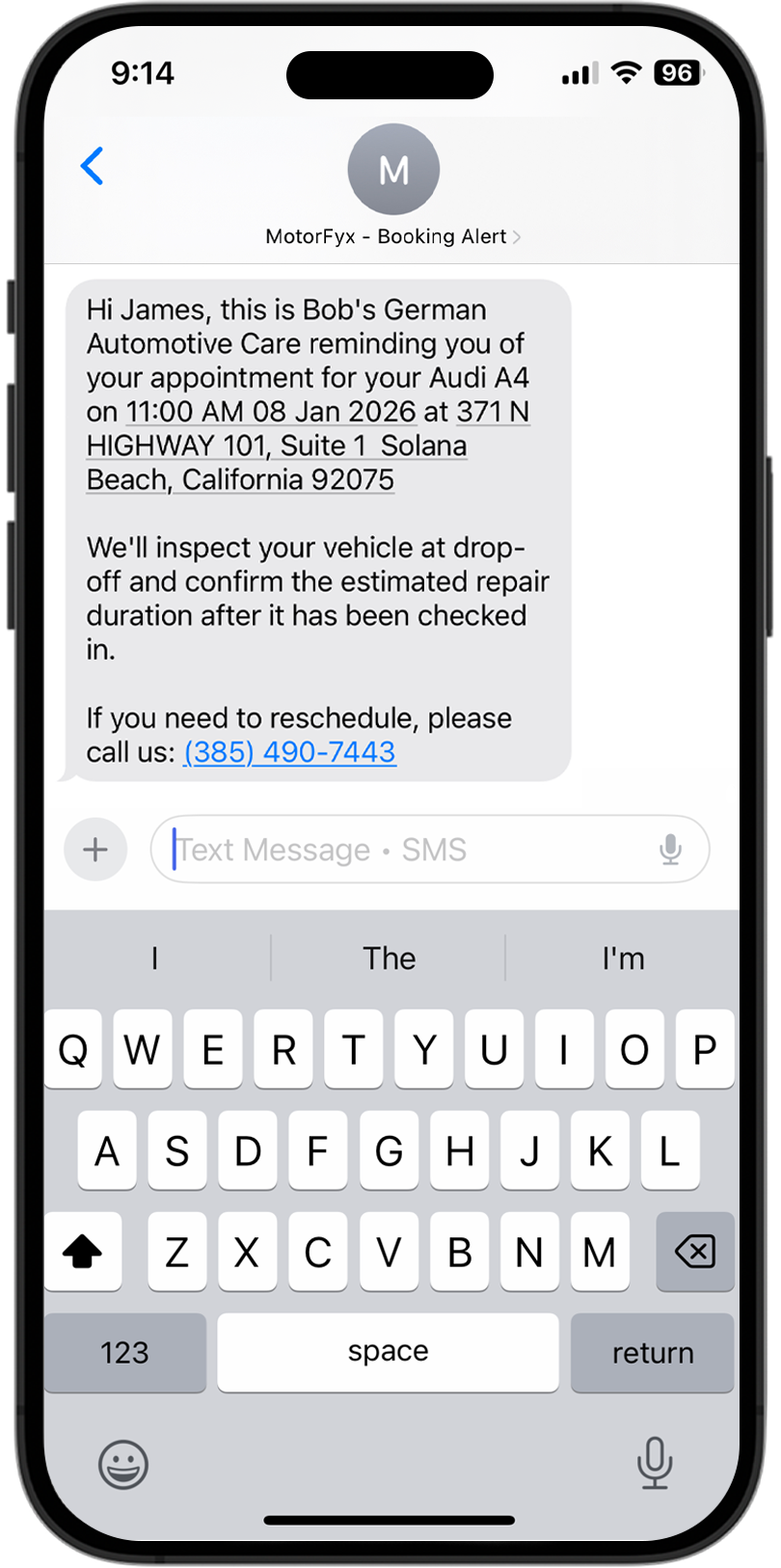 Every online booking triggers automatic text and email reminders before the appointment. Customers confirm or reschedule right from their phone — so you're not left with an empty bay and wasted time.