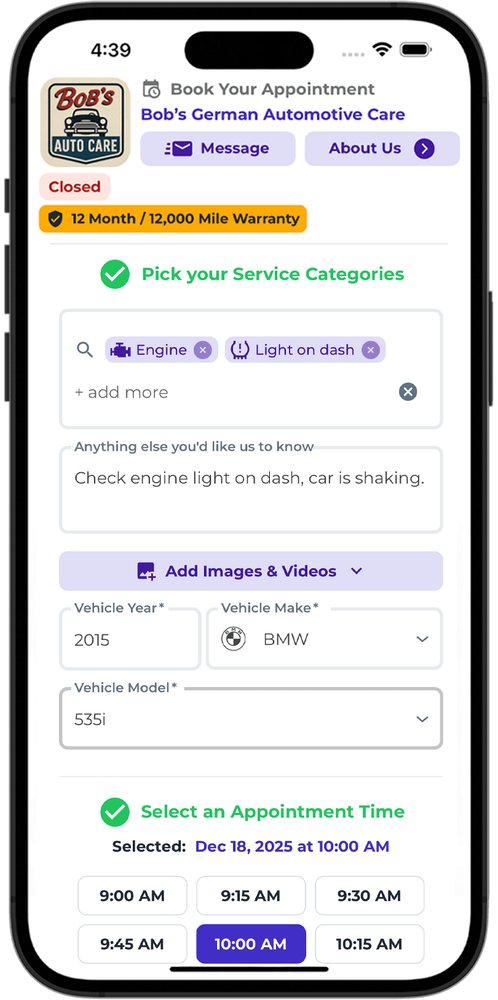 Let customers book online 24/7 while your team focuses on what they do best — fixing cars.